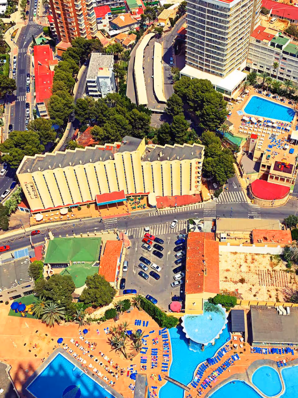 Das zweithöchste Gebäude in Benidorm ist das Grand Hotel Bali, mit einem öffentlichen Rooftop. Das muss ich mir noch ansehen und dann aber schnell weg hier. Ein weiteres Mal lasse ich mich von der Höhe eines Gebäudes und der Distanz dorthin täuschen. Ich laufe also weitere 1.5 Kilometer der Strasse entlang, an der prallen Sonne auf den Wolkenkratzer zu. Im Hotel Bali angekommen, verwundere ich mich, dass beim Lift zum Dach, der an der Aussenfassade in den 43. Stock hochfährt, niemand ansteht. Oben angekommen, stehe ich in einem leeren Raum mit einem Empfangsdesk, der nicht bedient ist. Öhm. Hola? Da ist niemand und auch die Türen, lassen sich nicht öffnen. Dieses Rooftop scheint hier niemand ausser mir zu interessieren. Hat schliesslich keine Bar da oben, denke ich. Ich winke in die Überwachungskamera, warte und versuche unterdessen ein Foto aus dem Kippfenster vom Treppenhaus zu machen. Nach ein paar Minuten kommt dann tatsächlich noch eine Empfangsdame, die mir 6 Euro abknöpft und mir die Tür zu einem weiteren Stockwerk öffnet. Für den Rest lasse ich Fotos sprechen. Irgendwie surreal mit diesen überzeichneten Farben aber passend, find ich.