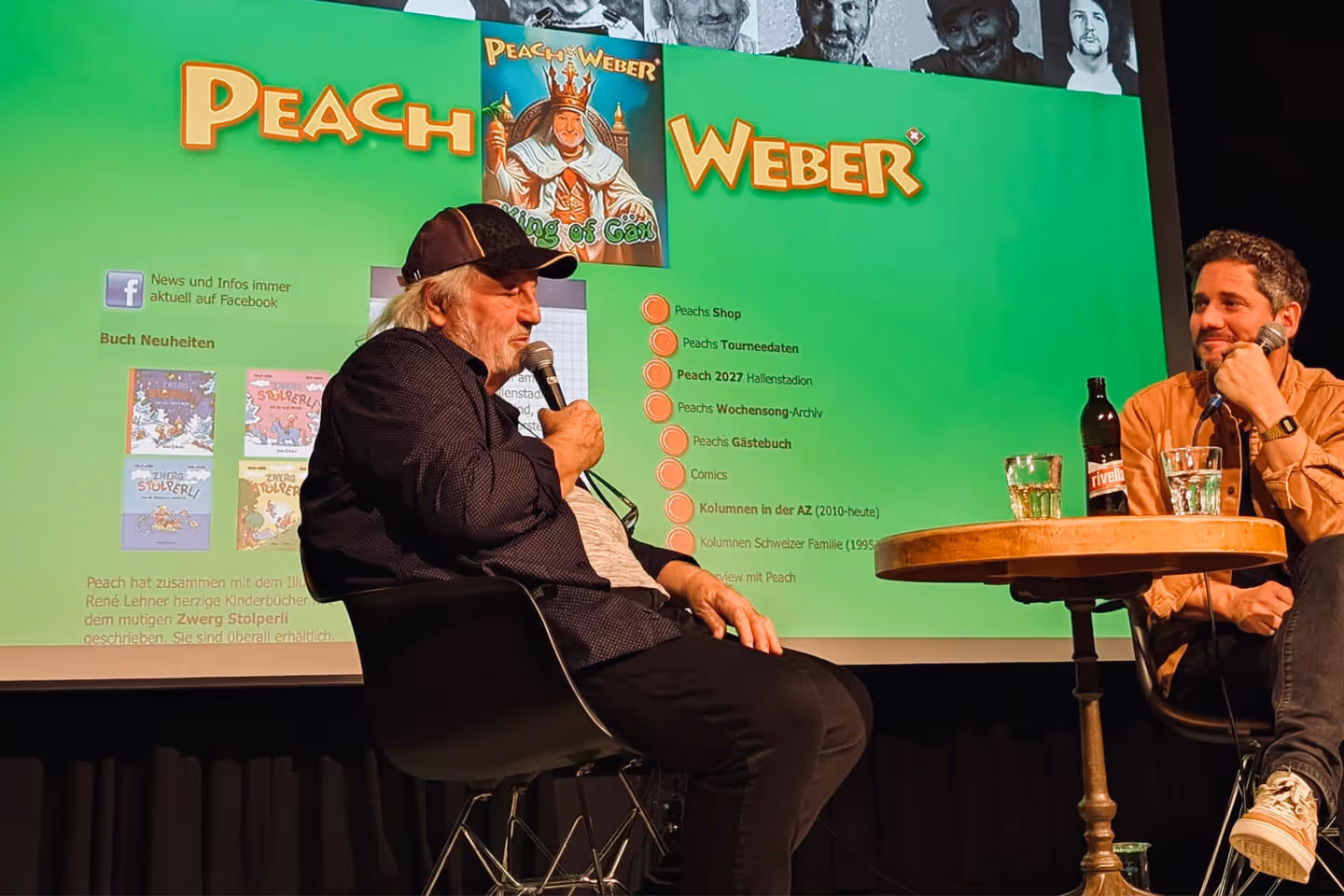 So kam es, dass ich vergangene Woche mit Peach Weber auf der Bühne stand – beziehungsweise sass. Denn Peach unterhält grundsätzlich im Sitzen. Schliesslich war er, wie er selbst sagt, quasi der erste Stand-up-Comedian der Schweiz. Und weil er wusste, dass so eine Show länger dauern kann, hat er sich von Anfang an hingesetzt – womit er auch zum ersten Sit-down-Comedian wurde (badumm-tss).