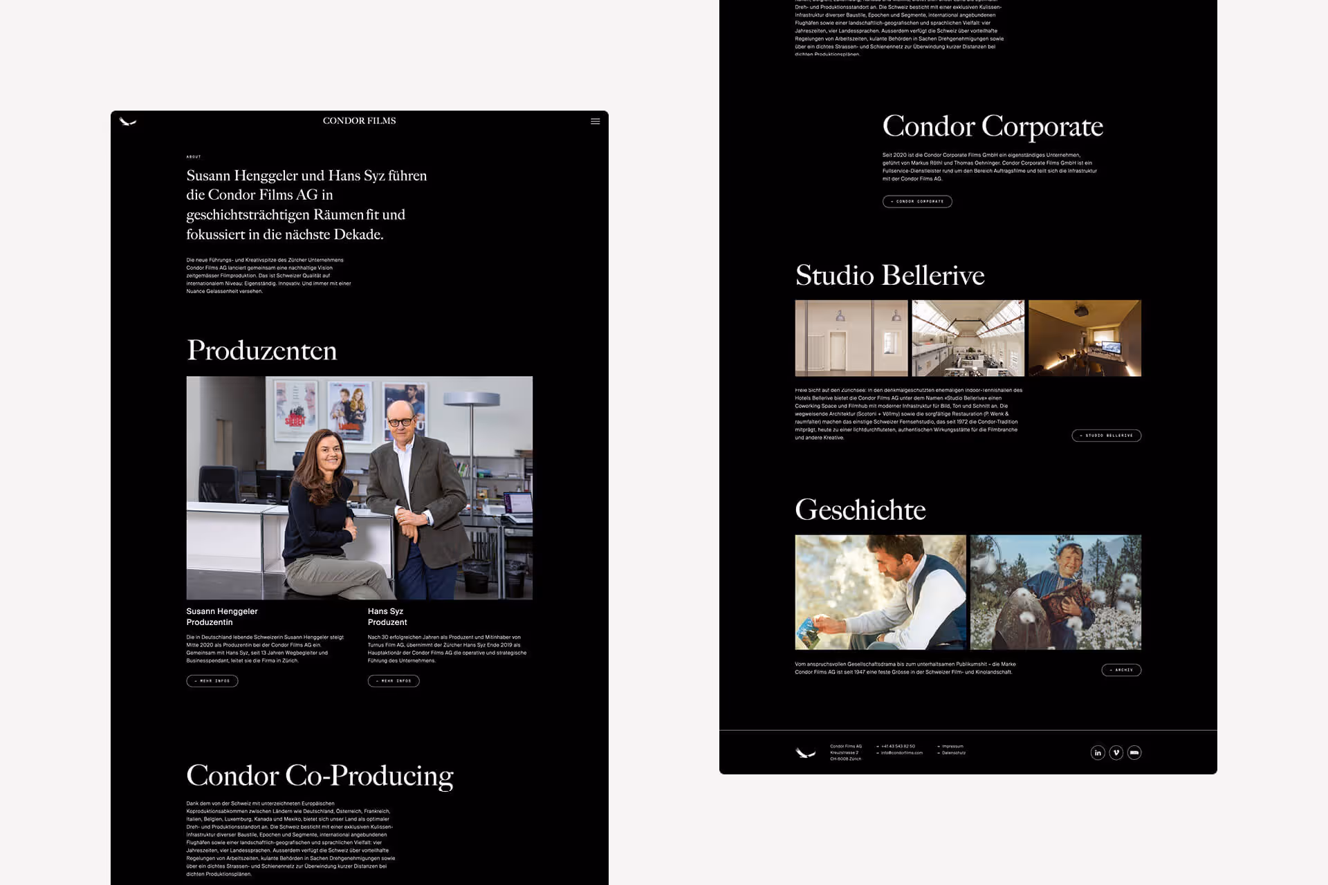Seit über einem halben Jahrhundert prägt der Name Condor, als führendes Unternehmen in der Filmproduktion die Schweizer Filmlandschaft. Für Xavier Kollers «Reise der Hoffnung» gab es 1991 sogar einen Oscar und internationalem Ruf für die Produktion. Seit 2020 führt Hans Syz Condor Films als zeitgemässe Filmproduktion in die nächste Dekade. Angekündigt wurde dies mit einer temporären Coming-Soon-Landingpage, wie es sich für die Filmbranche gehört.