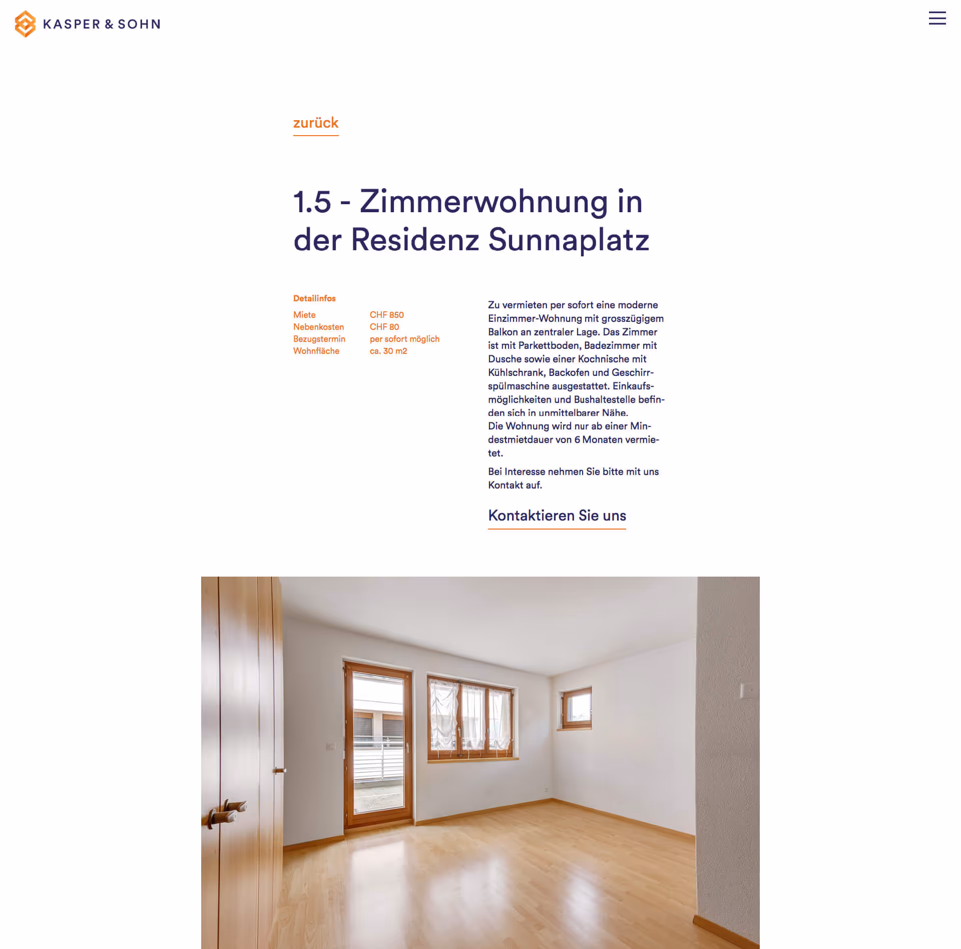 Die Webseite ist so konzipiert und designt, dass man mit grossen Headlines abgeholt wird und weiter in die Teilbereiche von Kasper & Sohn eintauchen kann. Feine Animationen unterstreichen die hochwertige Arbeit von Kasper & Sohn. Beim Backend entschieden wir uns erstmals für Neos. Texte und Bilder können vom Kunden direkt und effizient in der Webseiten-Ansicht editiert werden.