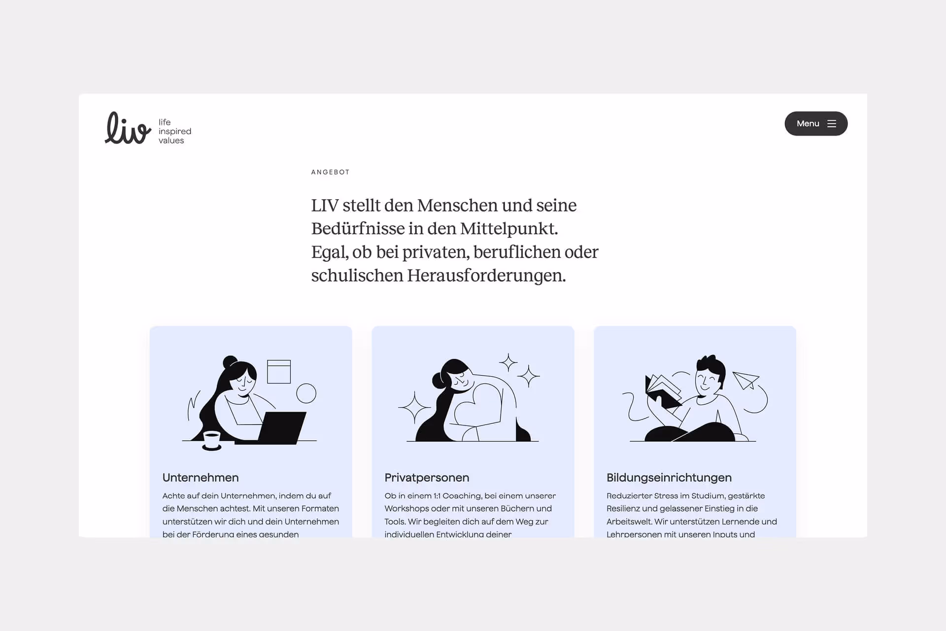Liebevolle gezeichnete, leichte und klare Illustrationen unterstreichen die Angebote von LIV und versinnbildlichen deren Inhalt.