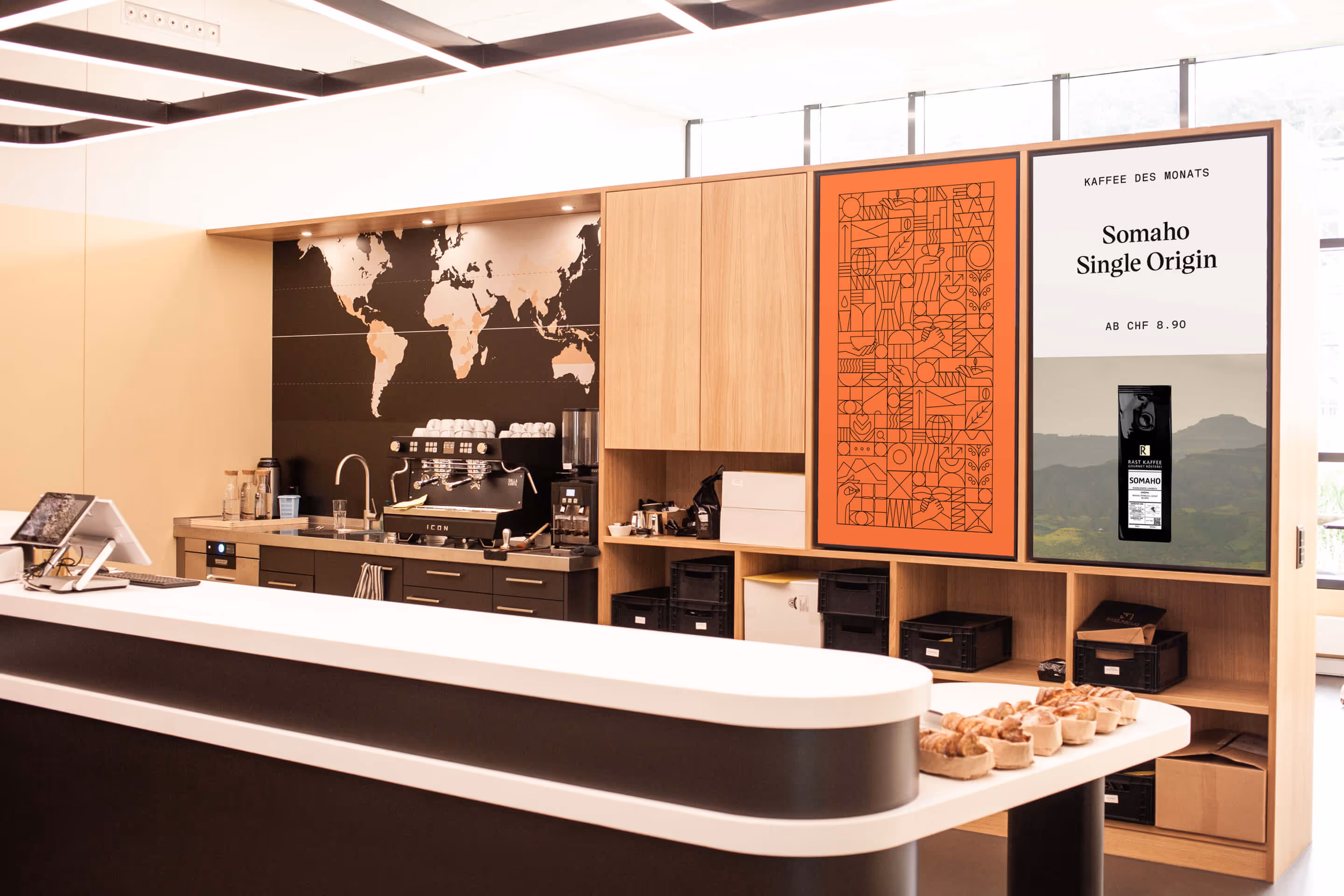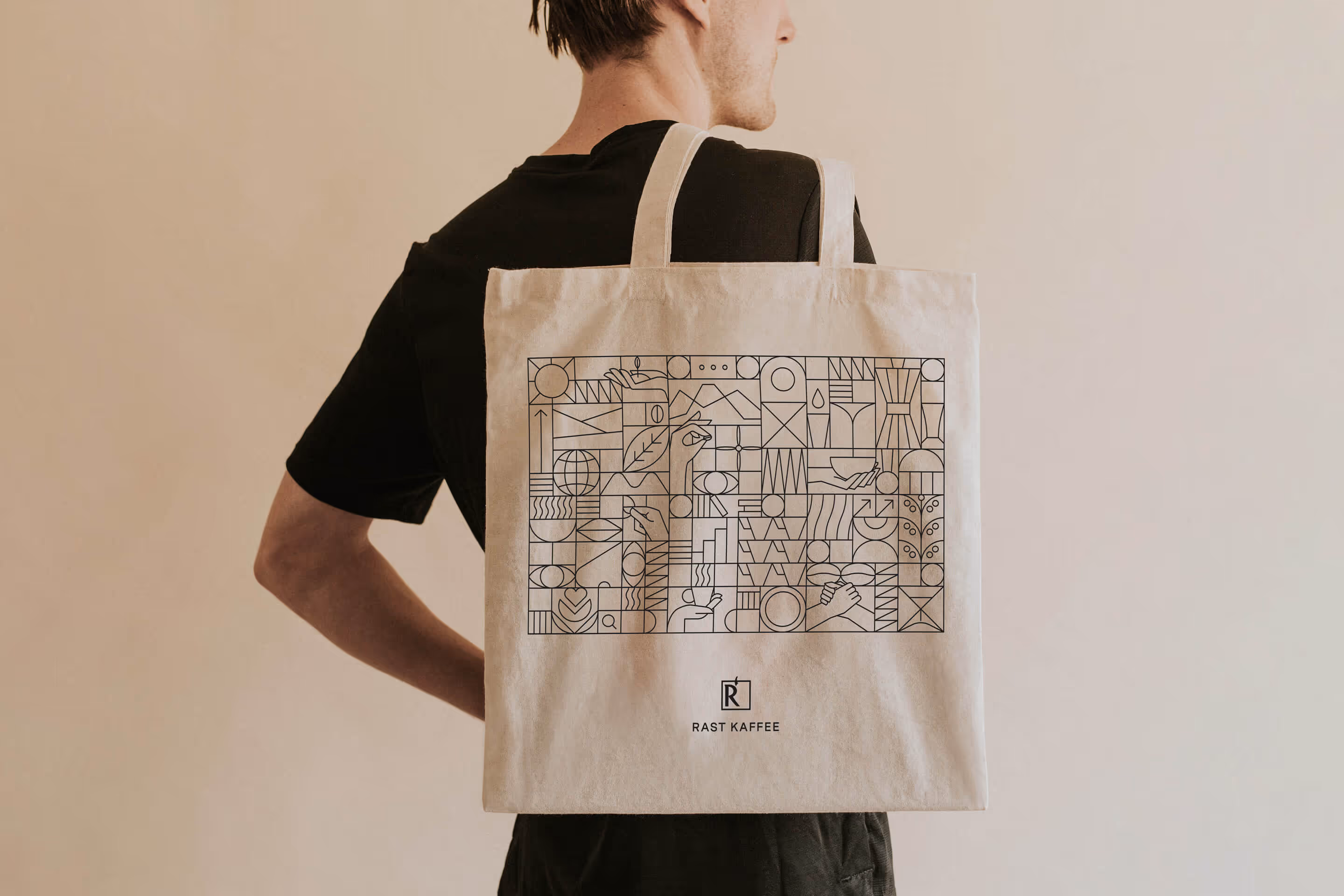 Mit der Reduktion des Logos haben wir eine Ausgangslage geschaffen, die uns einen sowohl dezenten als auch starken Einsatz ermöglicht. Die neuen geometrischen Illustrationen, ausgehend vom Quadrat im Logo, symbolisieren auf leichte, spielerische Art die Rast-Kaffee-Welt. Mit dem neuen Farbton und starken, authentischen Bildern beginnt die Markenwelt zu leben, von der Eröffnungseinladung bis hin zur umfassenden Website.